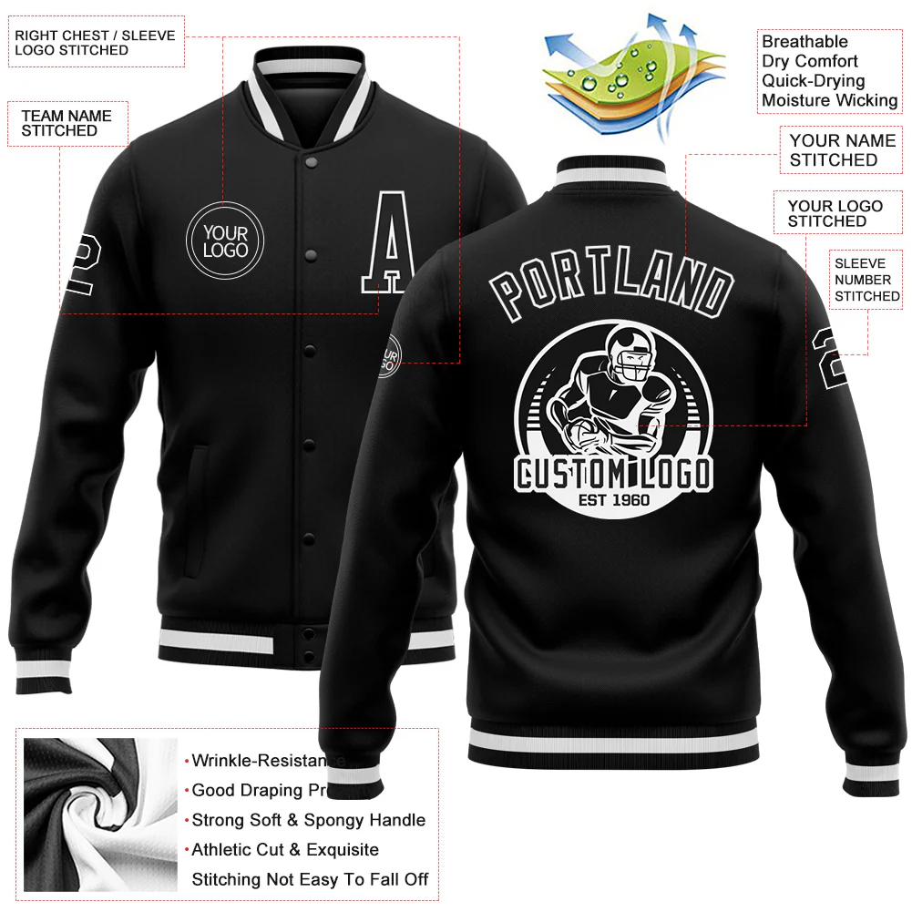 Custom Black & White Full-Snap Varsity Letterman Jacket – Personalized Name, Number & Logo
